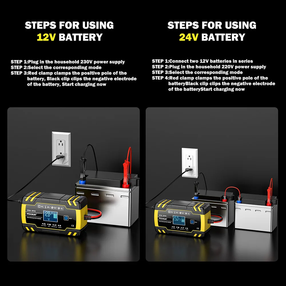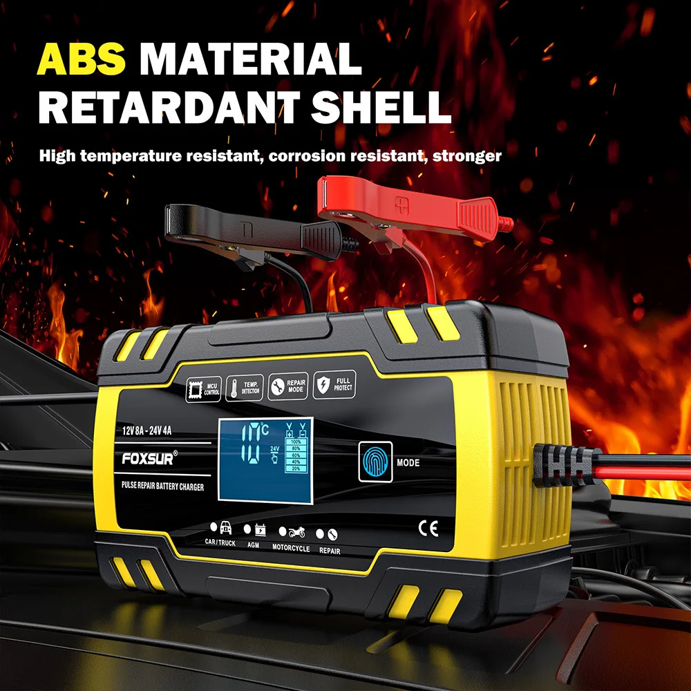 This dual-amperage smart charging system shifts automatically between 4A and 8A output based on battery size and chemistry, optimizing charge speed without risk of overload for either 12V or 24V systems. The LCD status display reveals voltage, current draw, and charging percentage in real time, while a four-stage charging algorithm ensures complete battery recovery from any state of discharge. Pulse repair technology works quietly in the background to dissolve internal sulphation buildup, preventing the permanent capacity loss that leaves older batteries permanently weak. The compact design makes it portable enough for RVs, boats, and trucks where space inside cabins and storage compartments is limited but power-tool-quality charging remains essential. Microprocessor monitoring continuously checks temperature sensors to cut amperage automatically if the battery grows warm, protecting both the charger and the battery from thermal stress.