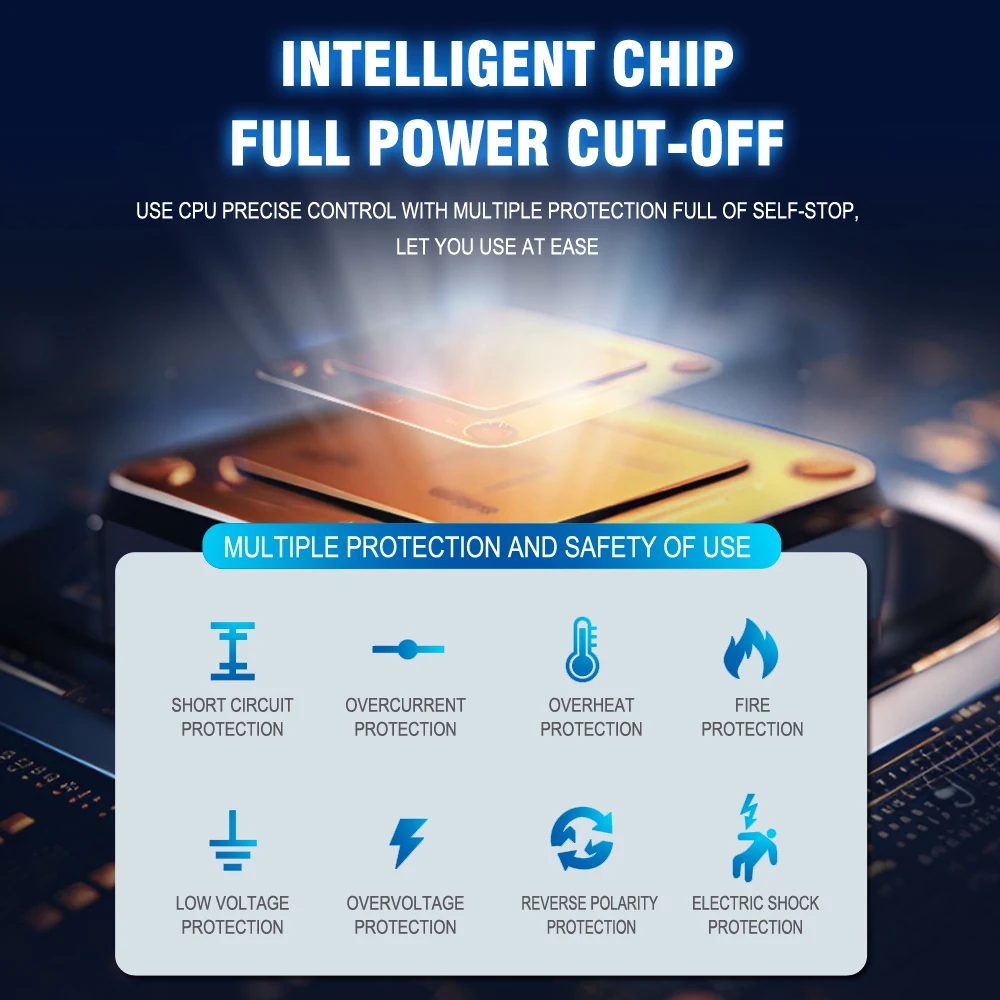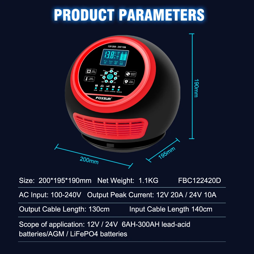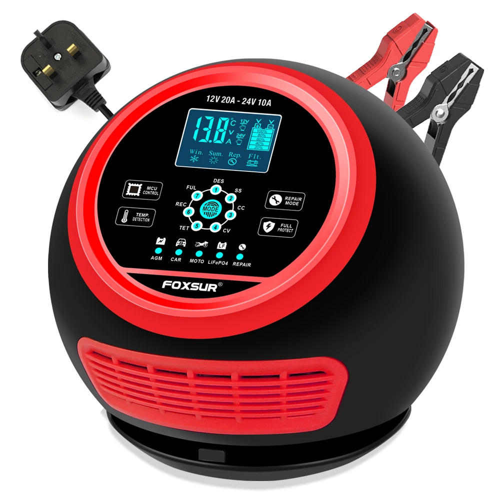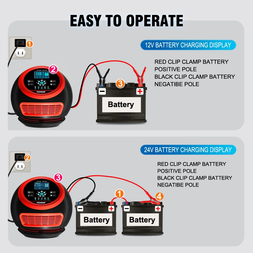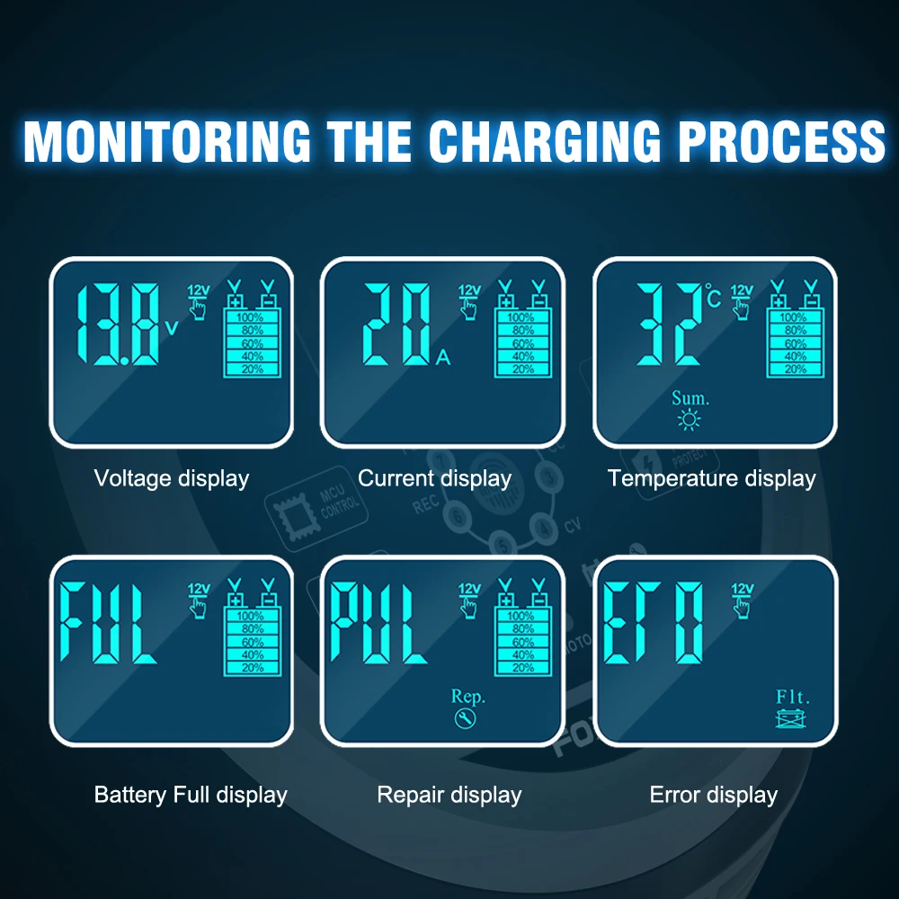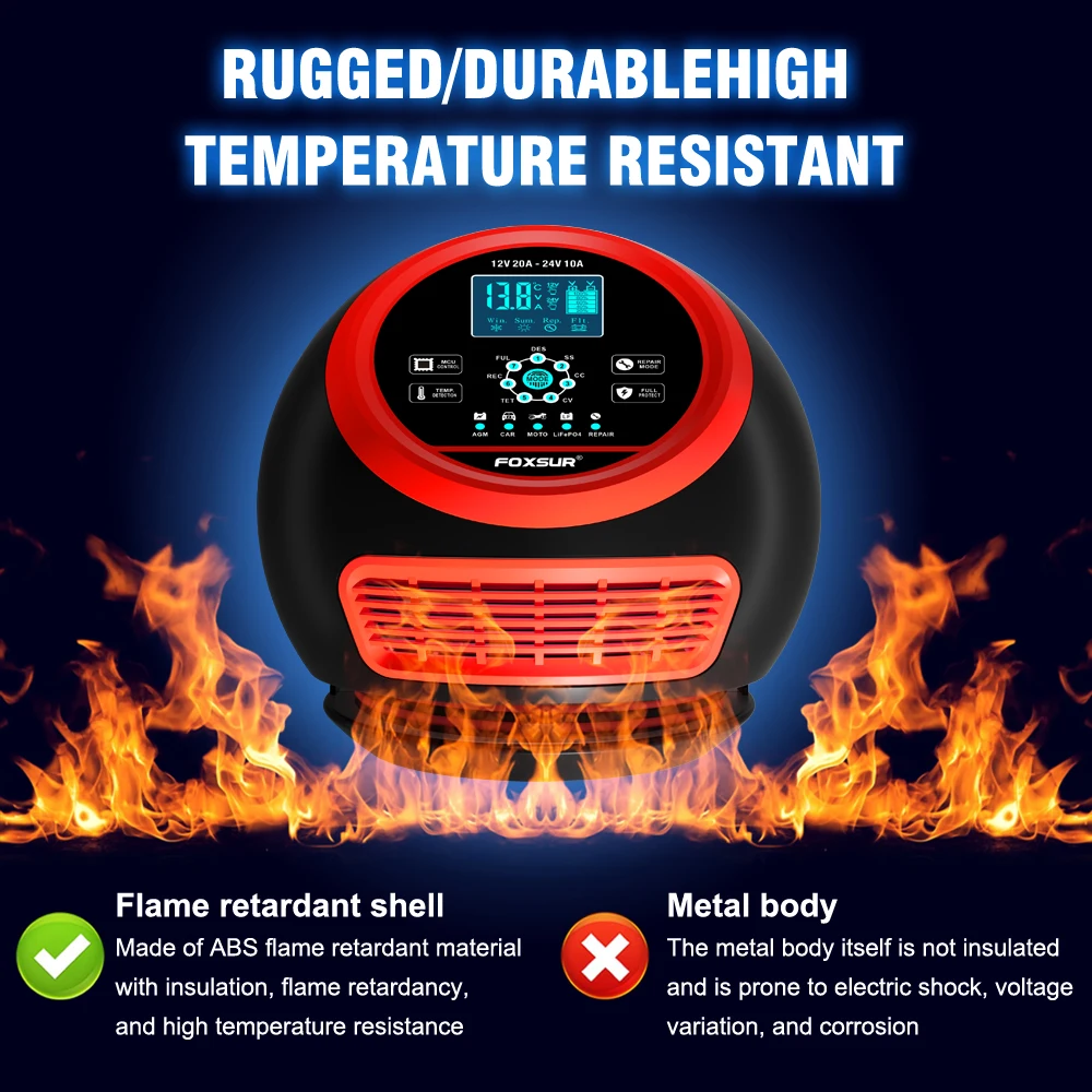 The automatic pulse repair technology regenerates battery plates by breaking down sulfate buildup, extending battery lifespan by months or years depending on battery condition. Dual voltage capability covers both 12V and 24V systems, making this charger suitable for cars, motorcycles, trucks, and marine equipment without adapter changes. Multi chemistry support recognizes lead acid, AGM, GEL, and LiFePo4 batteries automatically, selecting the optimal charging curve for each chemistry within seconds. Fast charging capability delivers 20 amperes to standard automotive batteries, reducing charge time compared to standard 10A chargers while the LCD display continuously monitors voltage, amperage, and battery temperature in real time. Advanced safety features include reverse polarity protection, short circuit shutdown, and thermal management to prevent overcharging or heat damage.